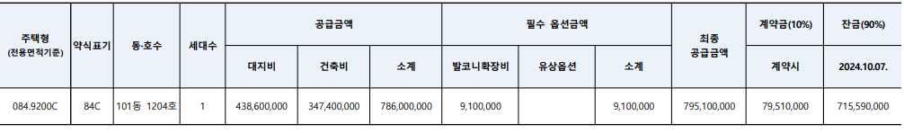 | 입주시기 | 2024년 10월 7일 (계약체결 후 계약금 및 잔금 완납 이후 입주) |